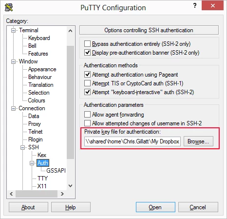 Navigate to Connection > SSH > Auth